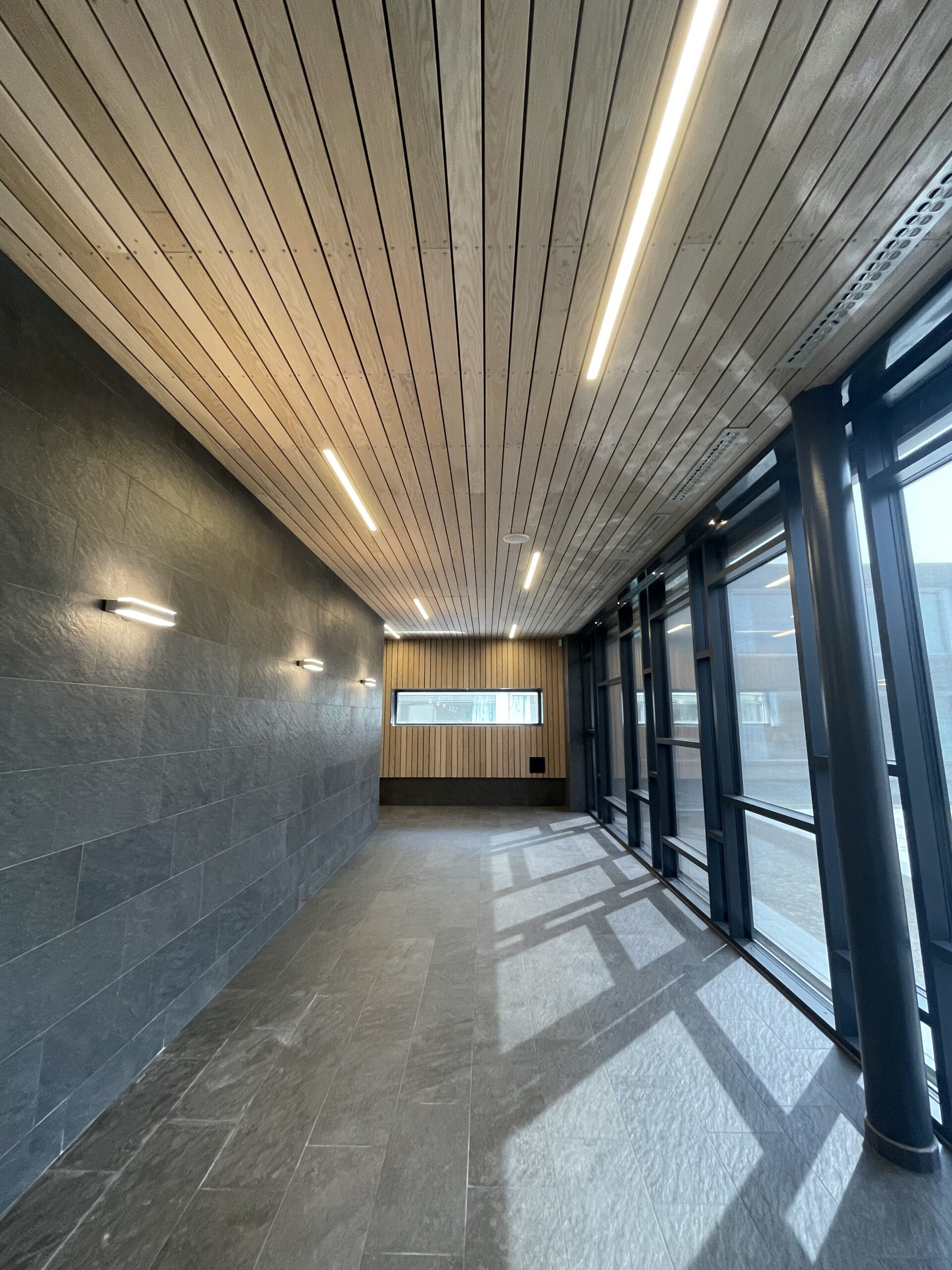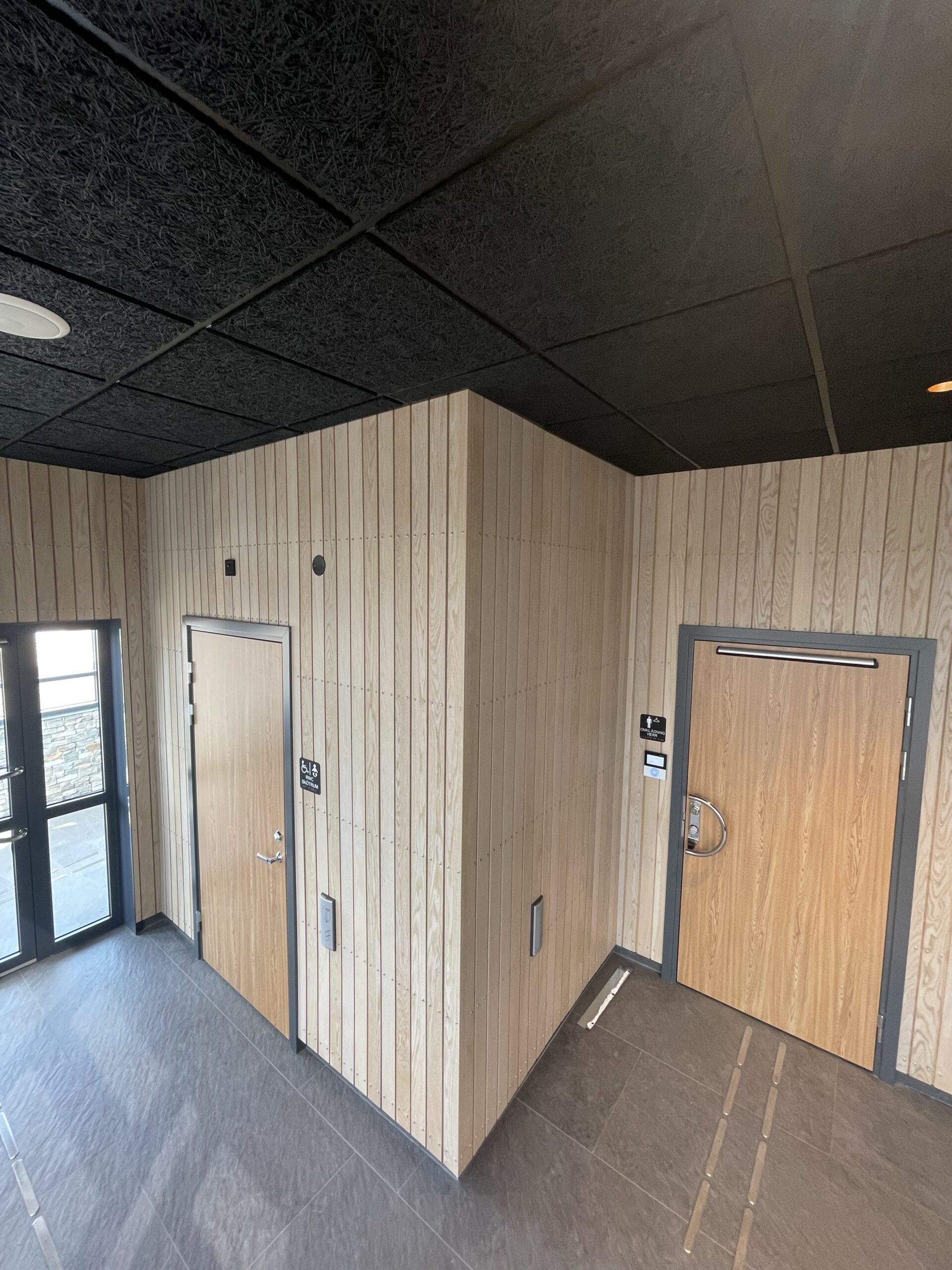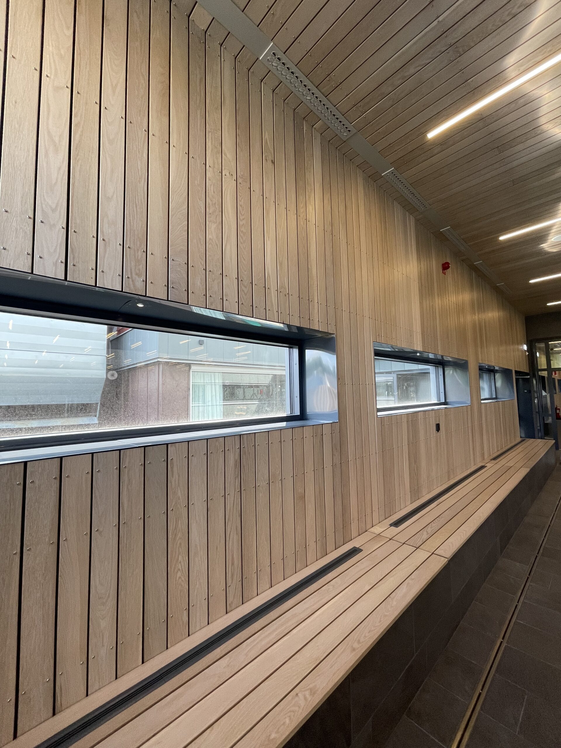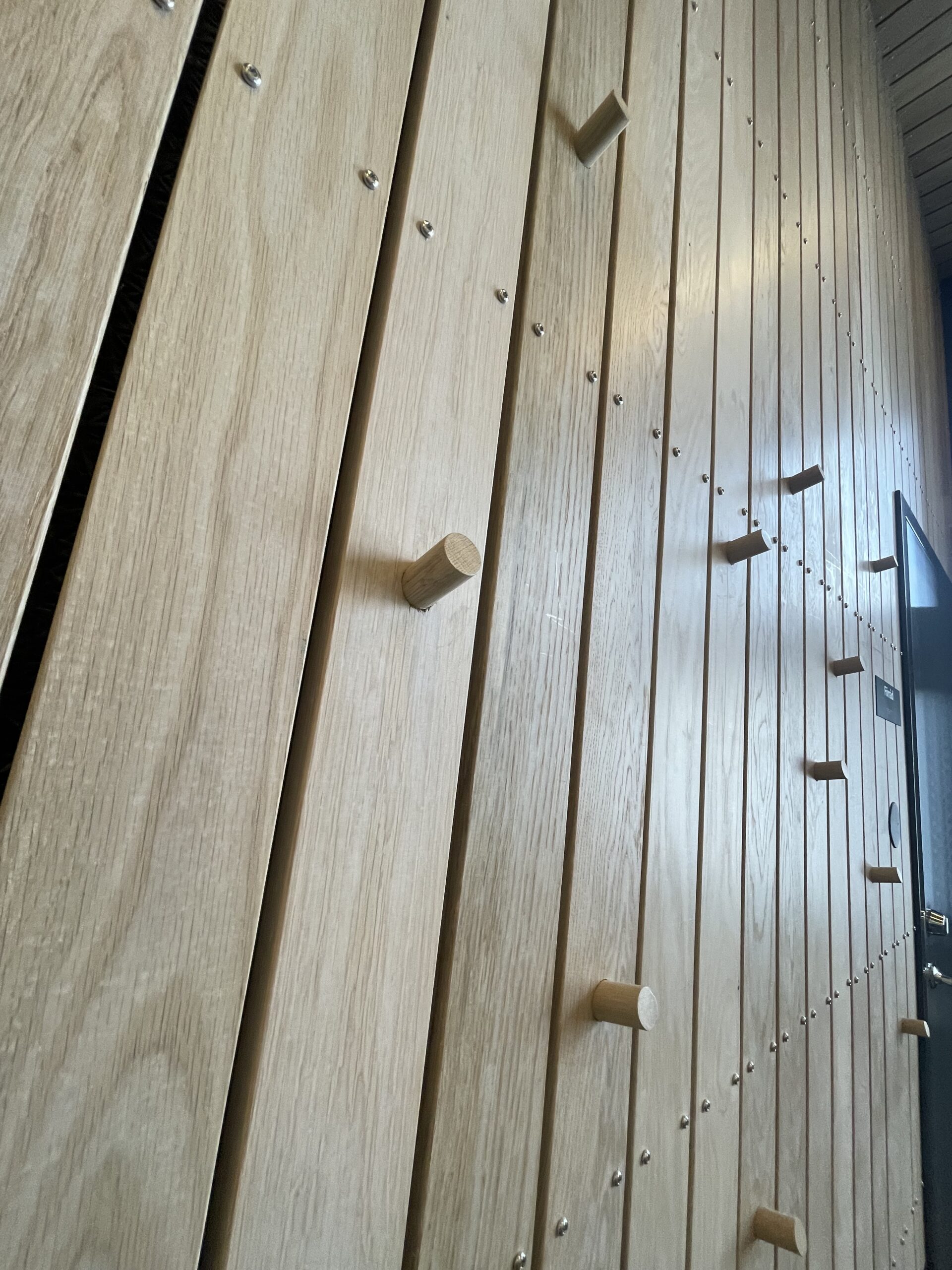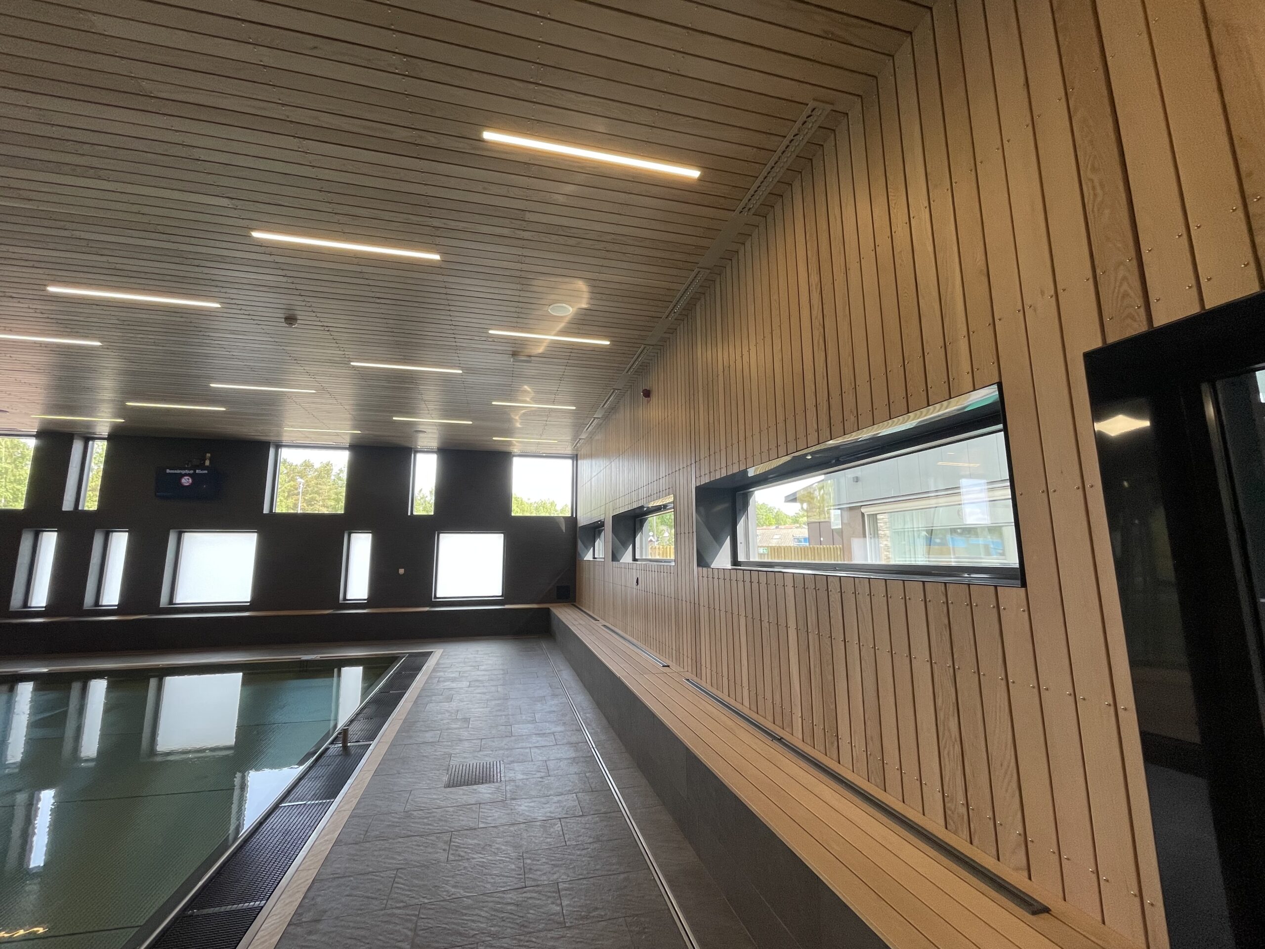 Detta är en spaltpanel i amerikansk vitek. Den varma tonen och träkänslan skapar harmoni i relaxavdelningen av simhallen på Töllstorp Rehab och Spa. Spaltpanelen är ytbehandlad med en 10% vitpigmenterad matt lack. Töllstorp Rehab och Spa erbjuder en unik upplevelse av avkoppling och välbefinnande.
